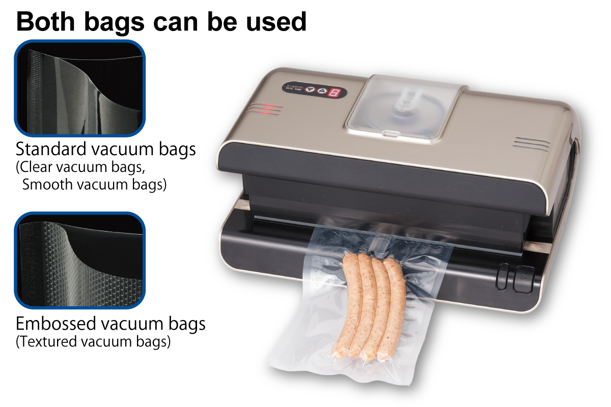(The vacuum-pack function after pre-sealing makes it possible to use embossed bags.(PAT.P))